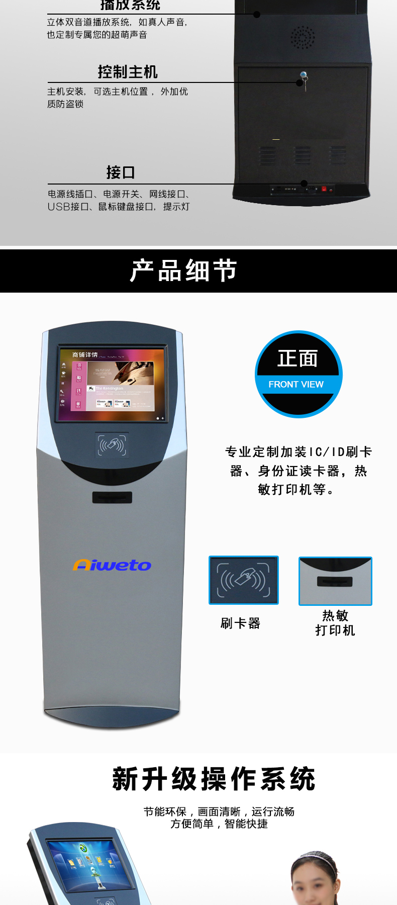 人體機學造型設(shè)計:人性化機型設(shè)計,符合人體站立姿態(tài)使用機器及視覺查看屏幕的最佳角度貼心細節(jié)設(shè)計,只為您使用更便捷。