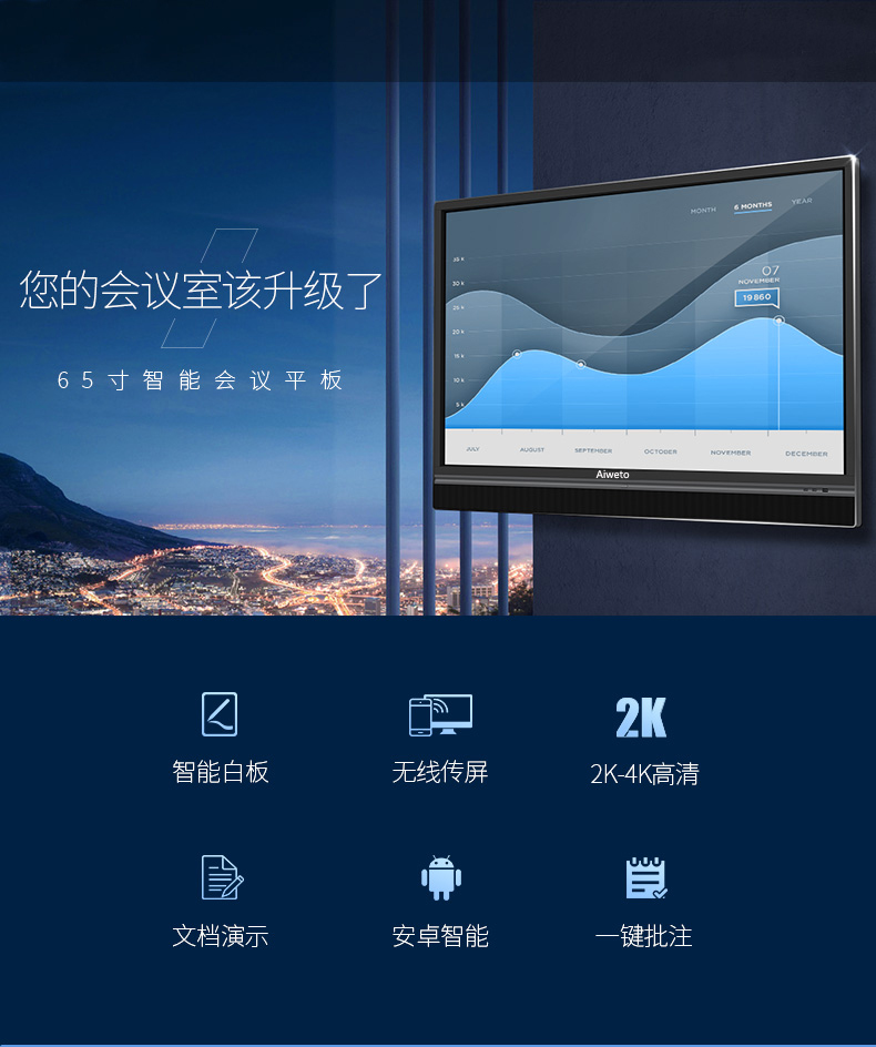 Aiweto(艾維圖)會議多媒體觸摸一體機采用LG商用IPS硬屏,全高(1920*1080)顯示,具有178度視角,高對比度和亮度,3D數字降噪,智能消除殘影、重影等失真現象,使得顯示畫面更清晰,穩定,色彩更鮮艷;
