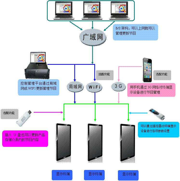 多種網(wǎng)絡(luò) 方便實(shí)用 支持局域網(wǎng)、廣域網(wǎng)等組網(wǎng)方式,終端可通過LAN、WIFI、WLAN、3G網(wǎng)絡(luò)鏈接入網(wǎng),滿足有線無線聯(lián)網(wǎng)需求;無網(wǎng)絡(luò)時(shí),將做好的節(jié)目通過U盤也能更新 |